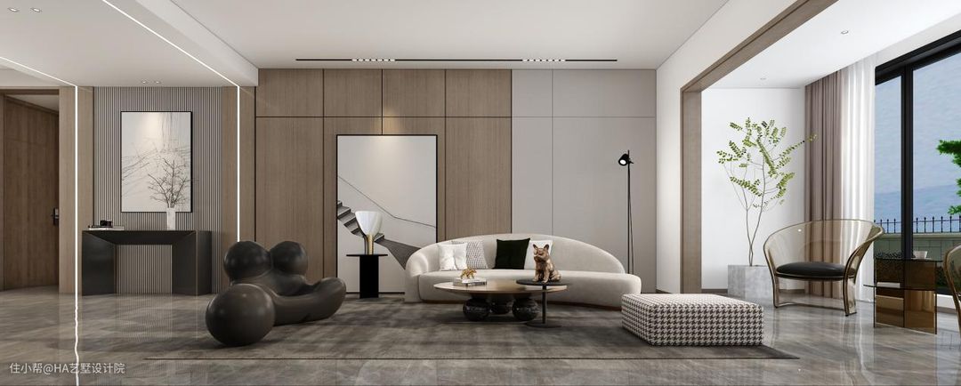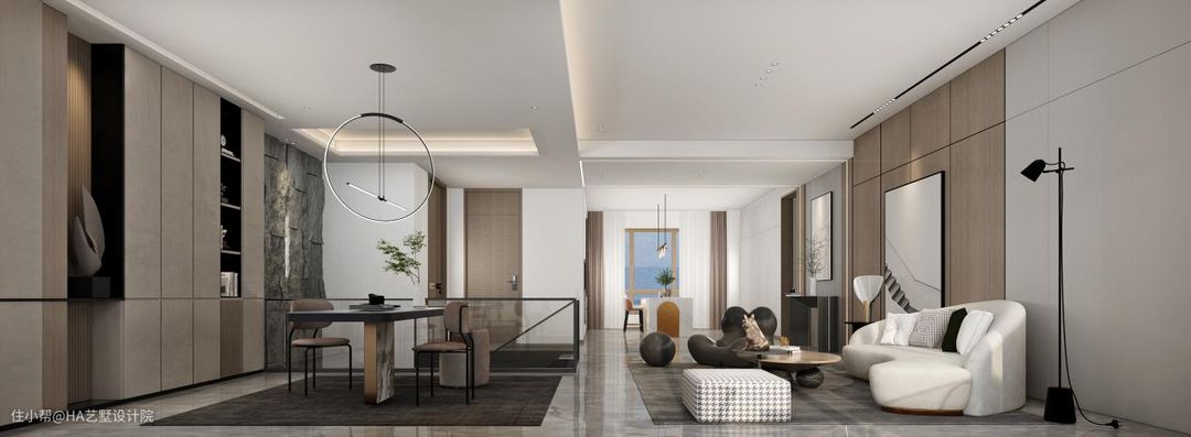走上楼梯便进入二楼起居室,室内面积巨大,地板同样采用大理石地砖通铺而成,整体墙面以软包材质和木格栅进行装饰,而且具有静音降噪的效果。起居室设置了一处弧形沙发, 配备了两款独特新颖造型的单人沙发,整体设计思维新颖独特,在素色中流淌着一种别样的美。