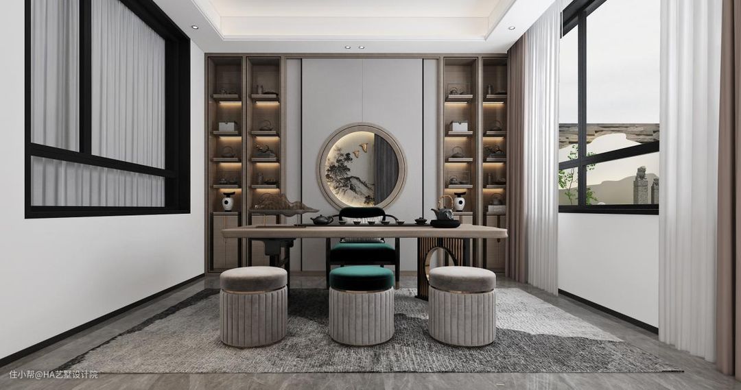 根据业主喜欢简单而又具有禅意的生活要求,设计师设计了一处茶室,房间中心设置了品茶桌和待客区,圆形凳子也显得特别可爱,茶室背景墙做了对称结构,两侧做了储物格可以收藏一些茶叶和工艺品,中部镂空做了一处圆形展示区, 一幅中国风画作可以在这儿展示。