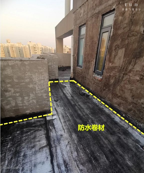 空间不大,地面现浇的位置铺了厚厚的防水卷材,墙面即使不漏水,但也进行了刷胶工序,算是买个保险吧!
