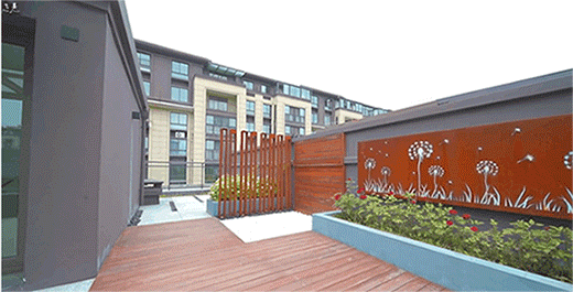 而露天部分设计高低花池种花种草,墙面也进行了装饰,角落处还预留了一块空间,铺上白色的石子,装饰性真的太好了。等到入住后还能买张桌椅,没事上来坐坐听听歌,看看风景,生活就该这么享受。
