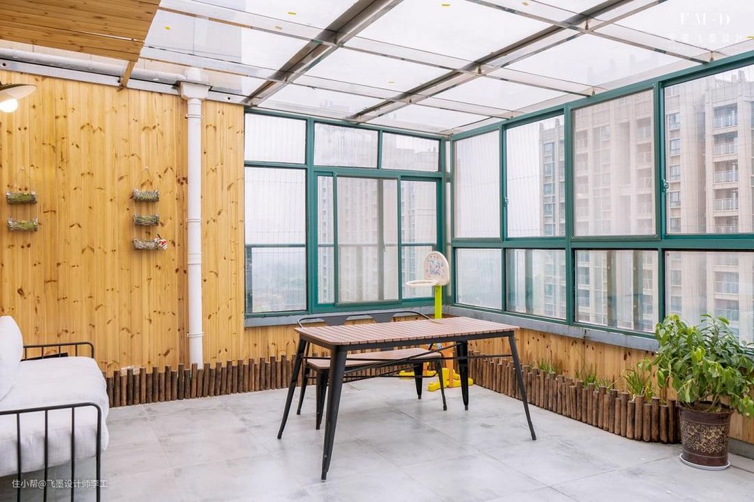 改造后的露台一半露天一半设计遮阳棚,我们先来看看遮阳棚下面,冬天晒衣服晒被子,或者是约上三五个好友烧烤休闲都可以,也不用担心下雨天气。