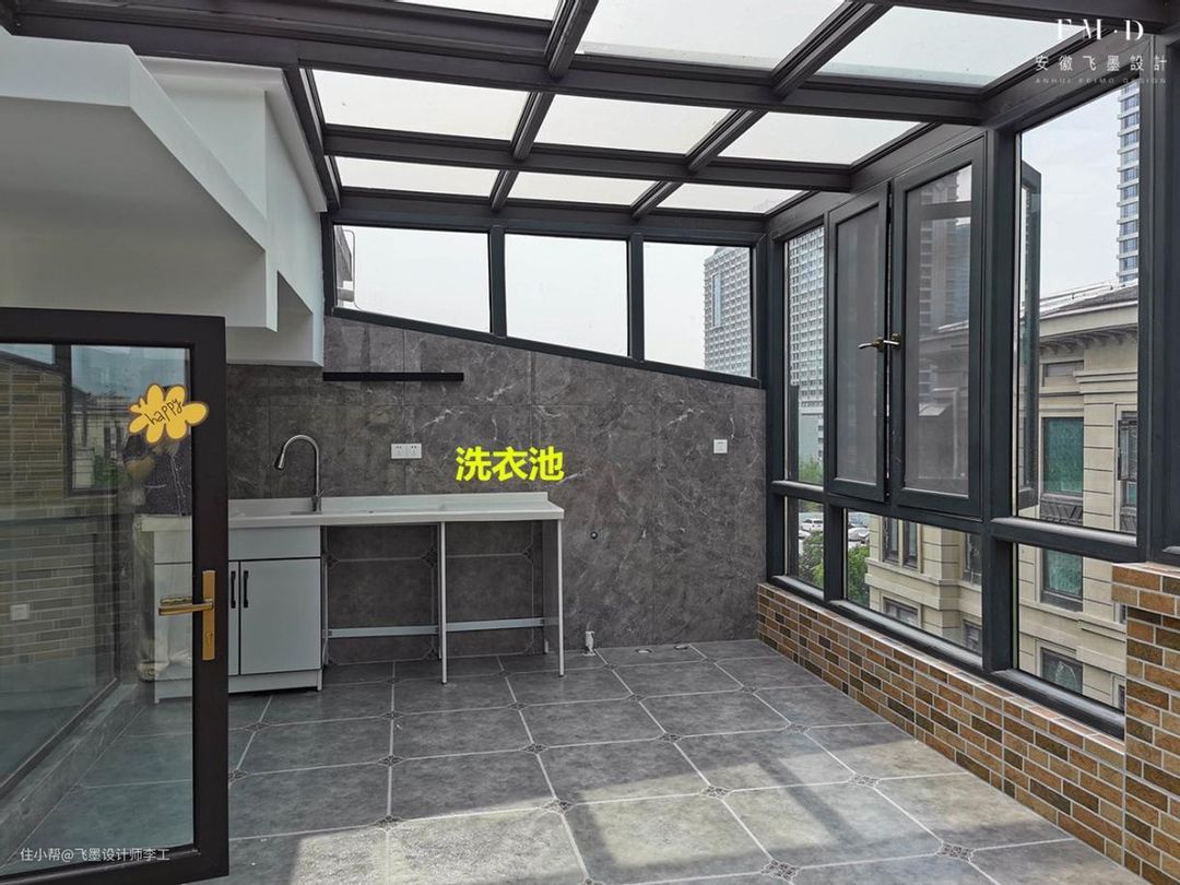 露台改阳光房最大的优势就是能一地多用,限制会少很多,可以像这位业主家一样改成洗衣房,洗衣晾晒更方便,空间大的还能设计成健身房,没事就能在家锻炼锻炼,因为周边有窗户,冬天休闲也不用担心凉飕飕的!