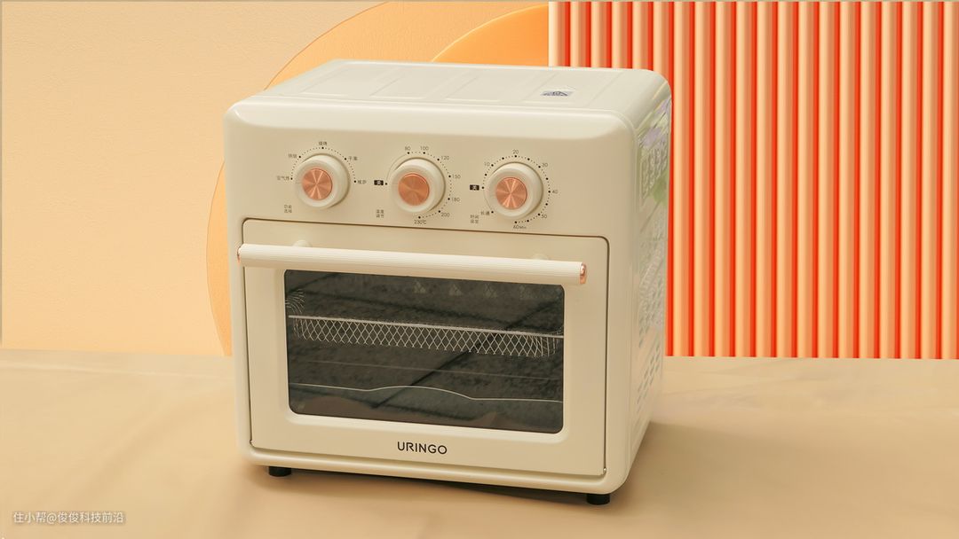 这款七彩叮当烤箱采用了旋钮操作,新手小白也能轻松上手。三个大旋钮外观经典复古,中央镶嵌铜色铝合金装饰圈,圆柱面压花条纹处理,旋转有明显阻尼感,但比较轻松,过渡平顺,手感舒适。左边的第一个旋钮是功能选择控制旋钮,具有空气炸、烘焙、烧烤、干果、披萨等功能;中间旋钮是温度调节旋钮,可调温度范围从80度~230度;最右边的旋钮是时间设定旋钮,可以设置的时间范围从0~60分钟,也支持长通功能;采用的是机械计时模式,到了设定的时间会听到“叮”的一声提醒。烤箱内的顶部有着4根发热管,底部有2根发热管,搭配热风循环系统,逼出食物油脂,外脆里酥。