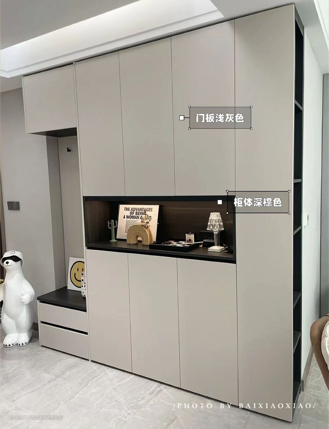 鞋柜门是月影白,但不是白色,是浅暖灰色,柜体颜色黑曜影木,深棕色,整体给人感觉平静、沉稳又不失温暖感。