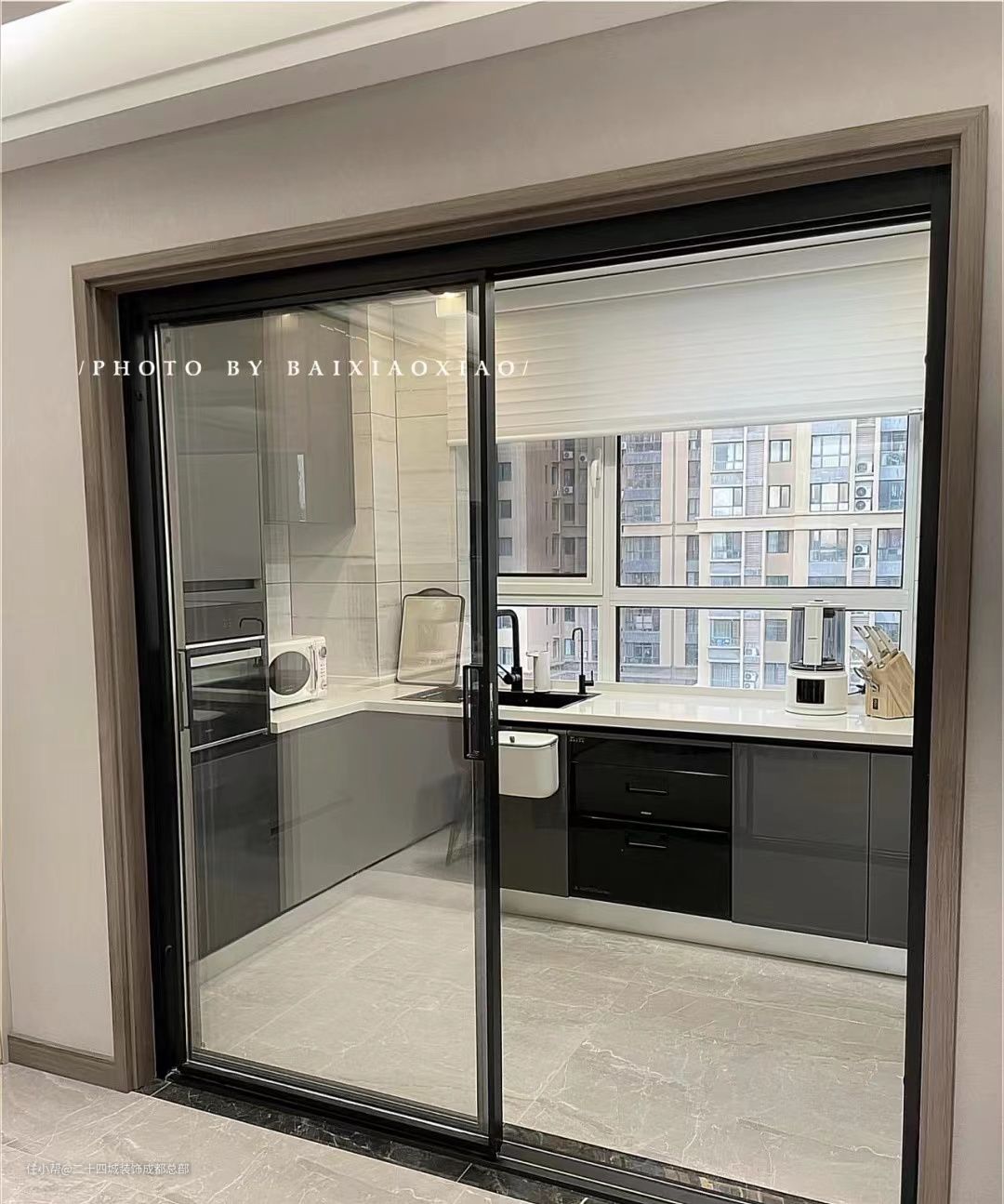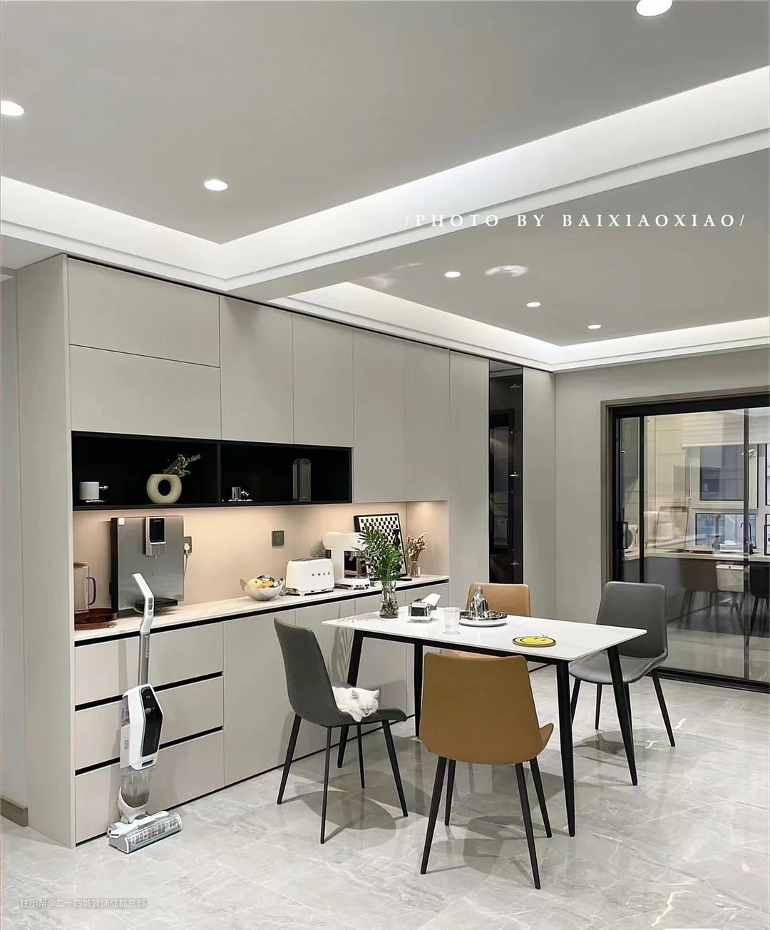 定制橱柜的门板选择的是亚克力门板,颜色是亮灰色,装好后整个厨房都蔓延着高级的氛围,搭配白色的瓷砖与台面,干净又好看。