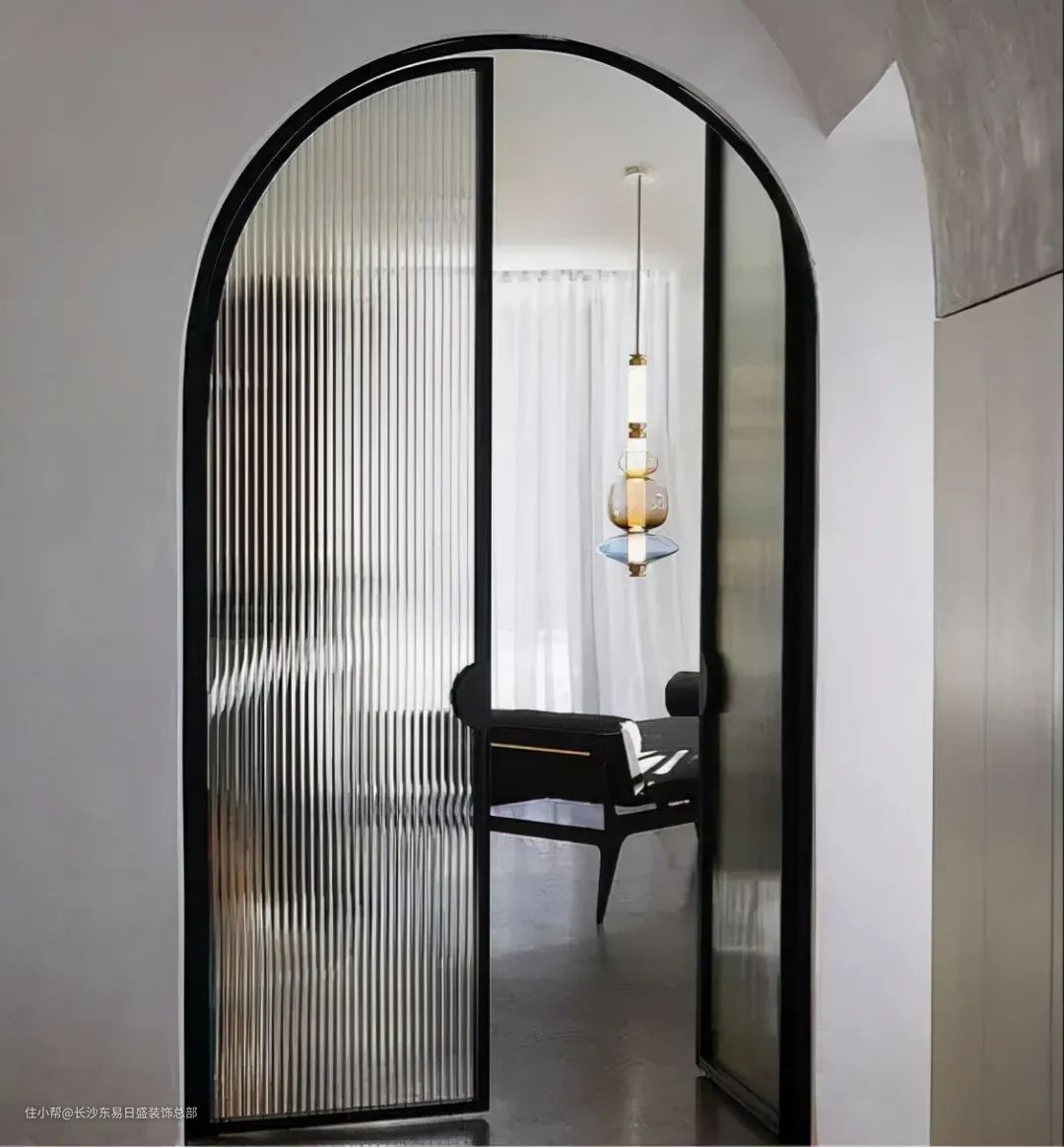 竖条纹压花玻璃的「竖」从视觉上会比其他几何线条更容易给人「高」的心理暗示,对层高偏低的户型来说,能缓解压抑。