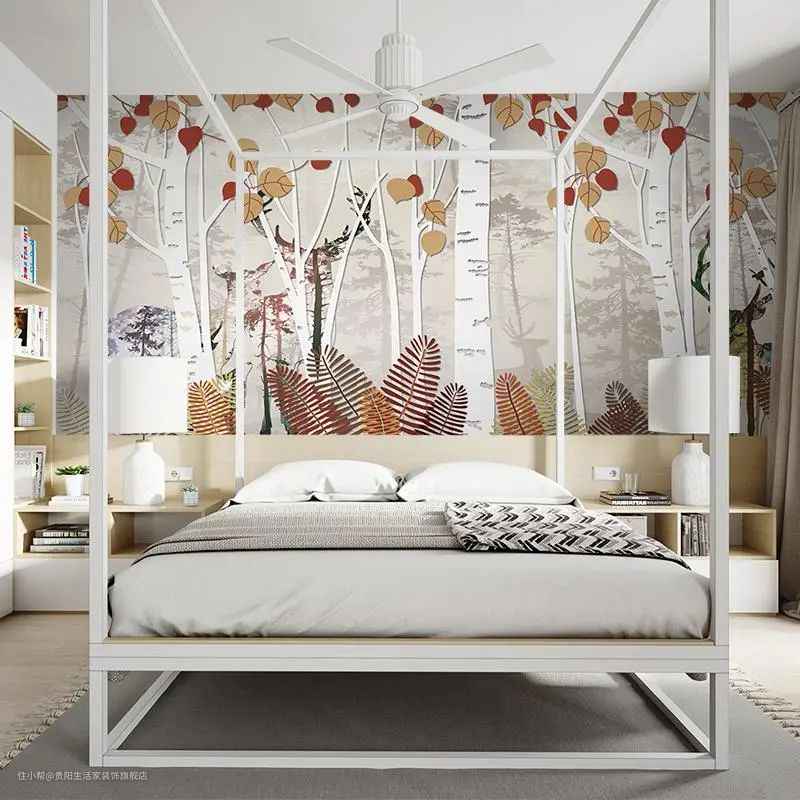 喜欢丰富墙面效果的,可以选择大面积构图的整体画,丰富有趣的墙布图案,也能让卧室显得更加艺术端庄~