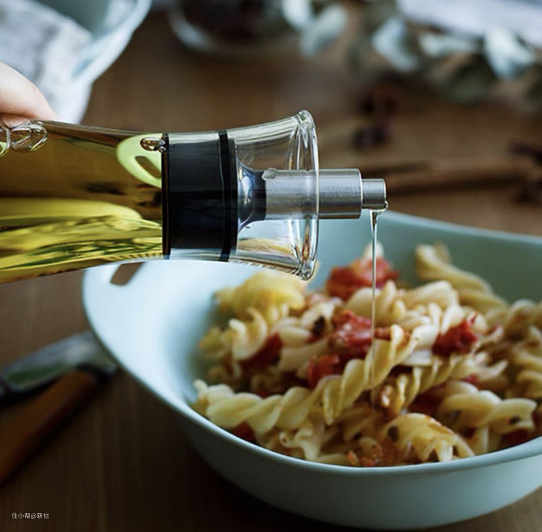 这个油壶,做成了双开口的,上面的黑色盖子,是小开口,油出量小,日常拌菜、炒菜能很好的控制用量。