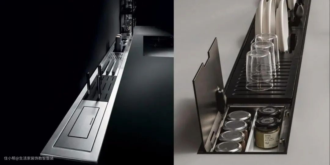 收纳储物空间的充分利用是隐藏式厨房的关键核心,在收纳方式上以及打开柜门的方式和传统的厨房都有着千差万别。