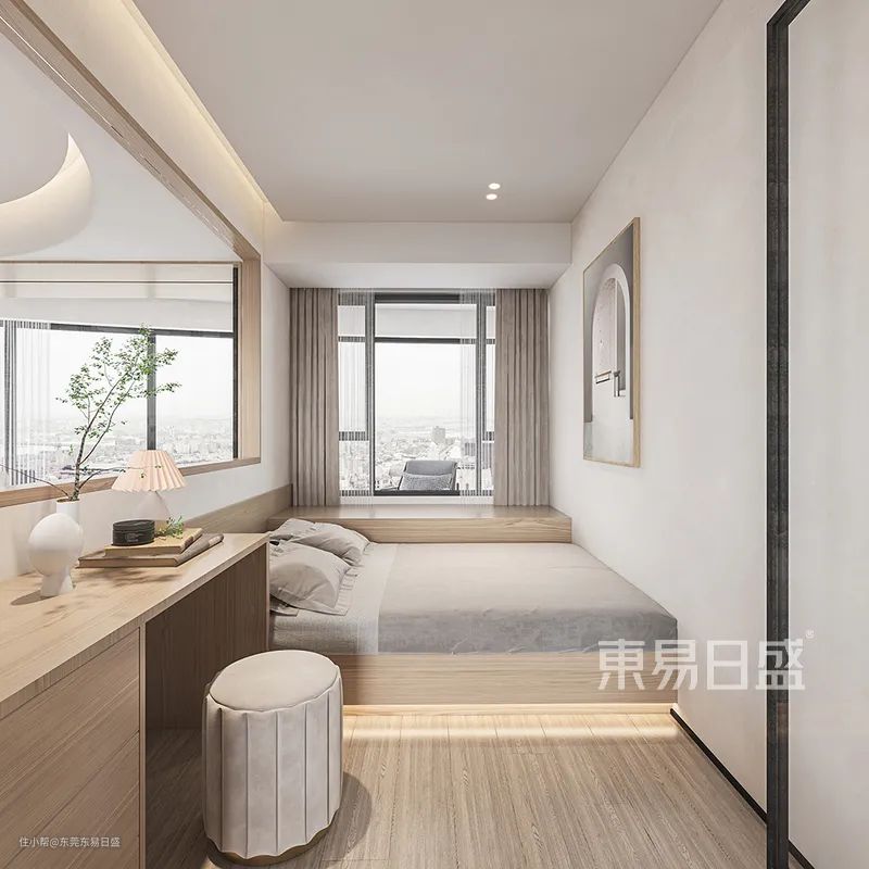 值得一提的是,通过镜面以及窗扇的组合搭配,将卧室的质朴清幽之美进行深度挖掘,给空间留足呼吸的「口」,侘寂风美感不必刻意追寻,已经油然而生。