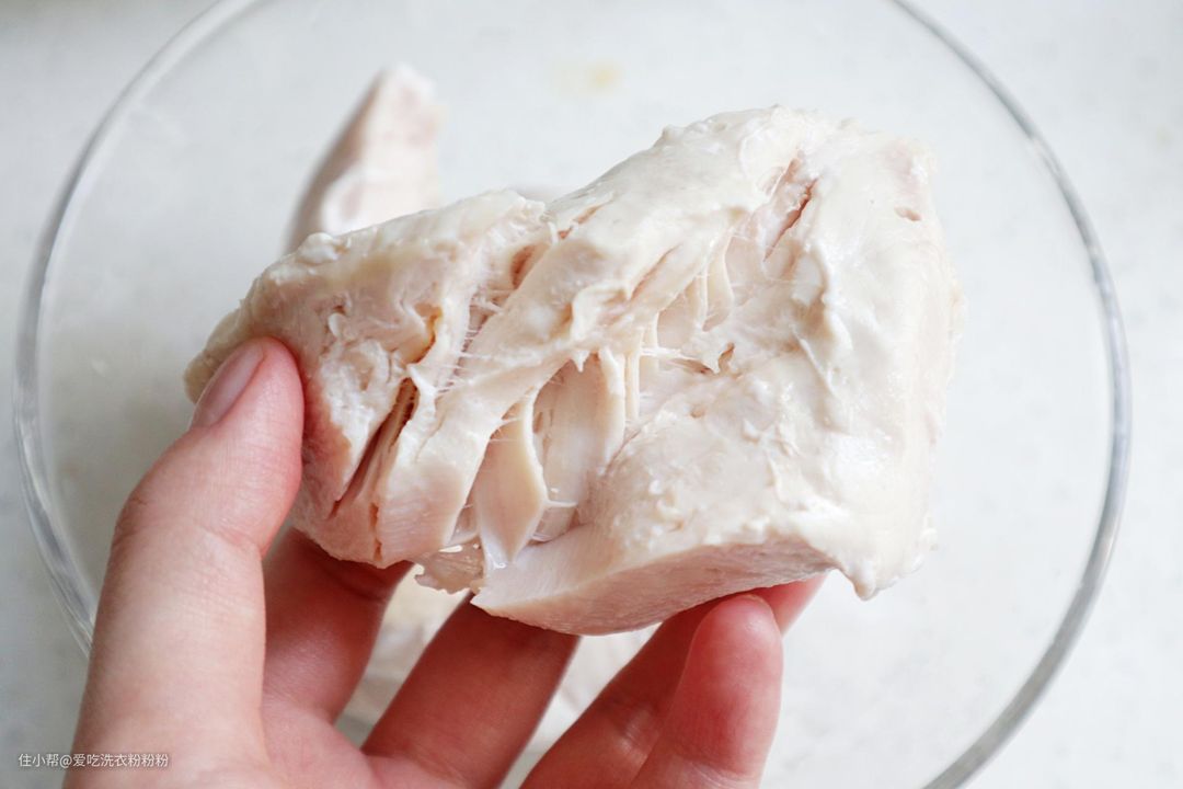 发挥自己的劳动力,把鸡胸肉撕成丝搅拌均匀就可以开吃了,作为佐餐小菜简直再好不过。
