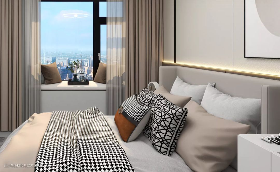主卧选择了沉静内敛的灰色为主调,床头背景做了硬包处理,将低奢与高贵的气质完美融合并加以演绎
