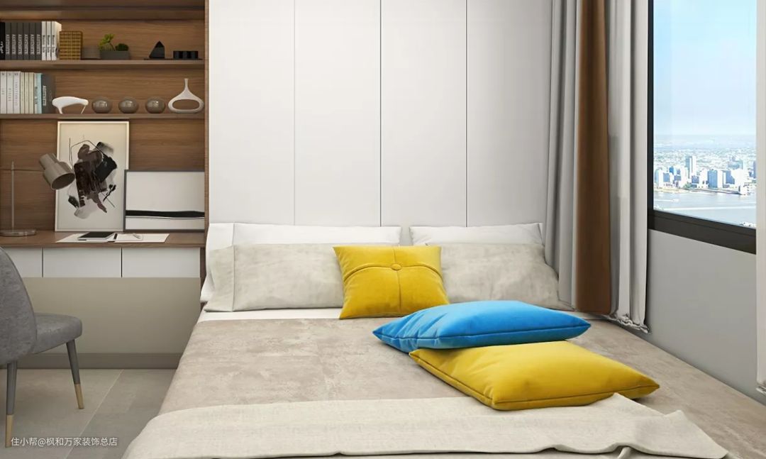 次卧以粉色+灰色的床品,搭配同色系窗帘,营造出整体清爽、轻松的感觉