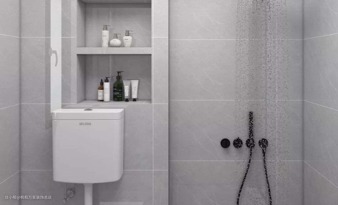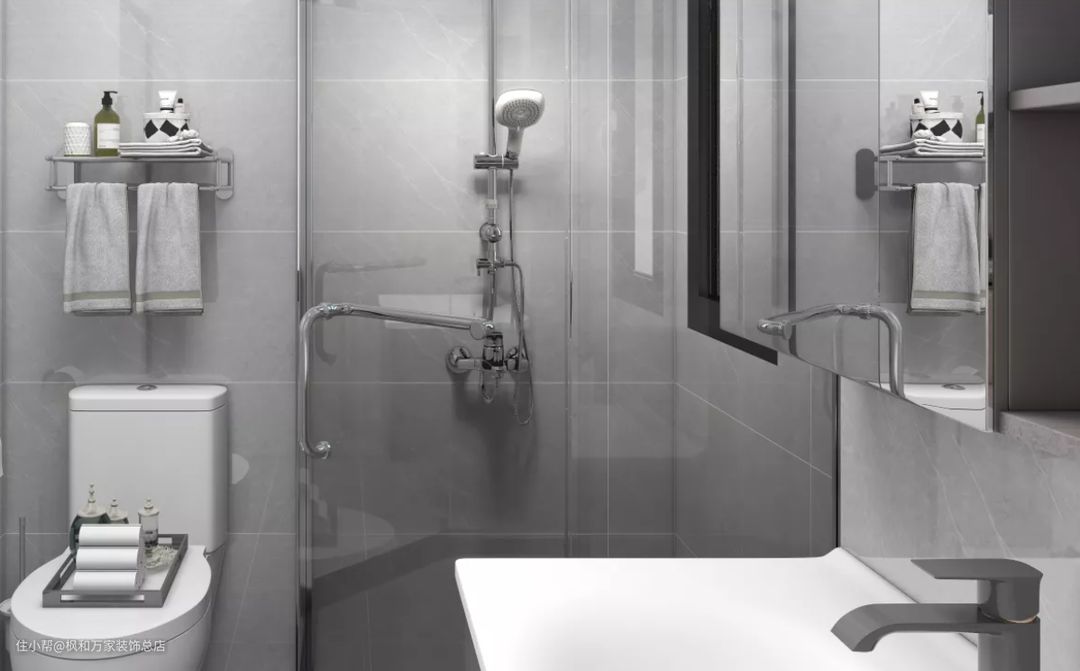 卫生间利用夹角位做了钻石型淋浴房,巧妙实现干湿分离。