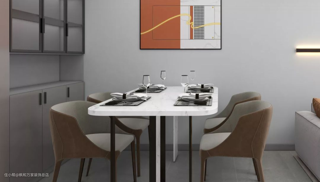 餐厅采用餐桌+餐椅的组合方式,将美感与实用完美结合,餐边柜在色彩上同样采用了灰色与黑色的清爽搭配,保证了客餐厅的风格统一性,丰富了空间的视觉感受。