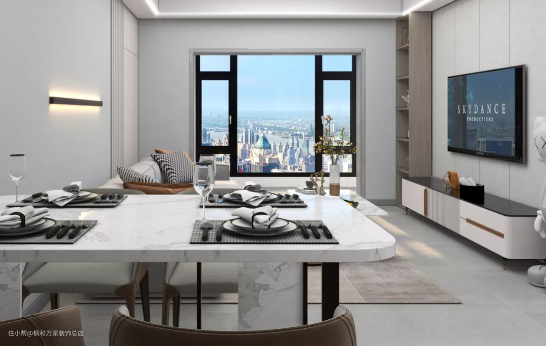 客餐厅全景,巧妙的利用墙面,将客餐厅的展示、储藏空间融为一体,不仅能适当减轻厨房的收纳压力,还能当做备餐区,提高了空间的利用率。