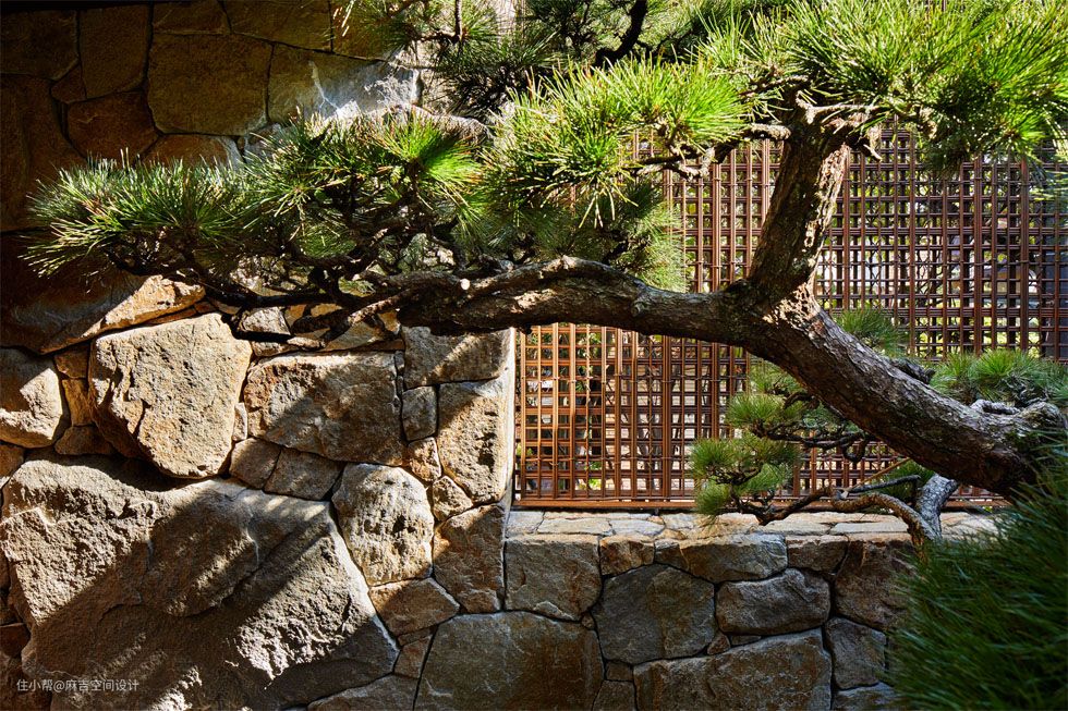 环形的连廊细致入微,意石禅松不卑不亢,绿树成荫,交相呼应。