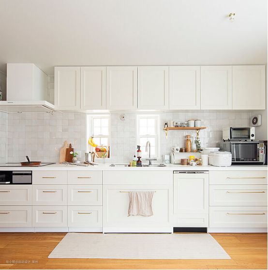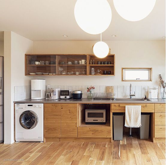 ▲图中,厨房所在的那面墙壁上,在最左边安排了洗衣机。微波炉也放在橱柜下镂空的柜子里 需要的东西成为一套的空间里,方便使用。原木色的架子靠在白色的厨房墙壁上,使整个空间很放松。二.直白的统一感。