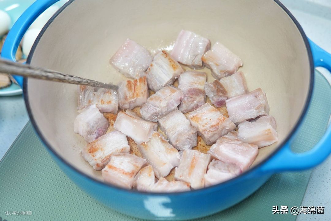 之后加入冰糖炒糖色,前面提到要用小颗粒的黄冰糖,就是为了这一步能快速融化让肉挂糖,八角桂皮等香料也可以在这一步加入。