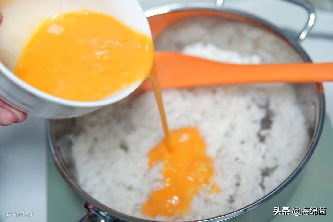 记得边淋入蛋液边快速翻匀,我因为一手拿碗一手拍照,所以没有同步操作,操作快一些能让蛋液与饭粒更加均匀。
