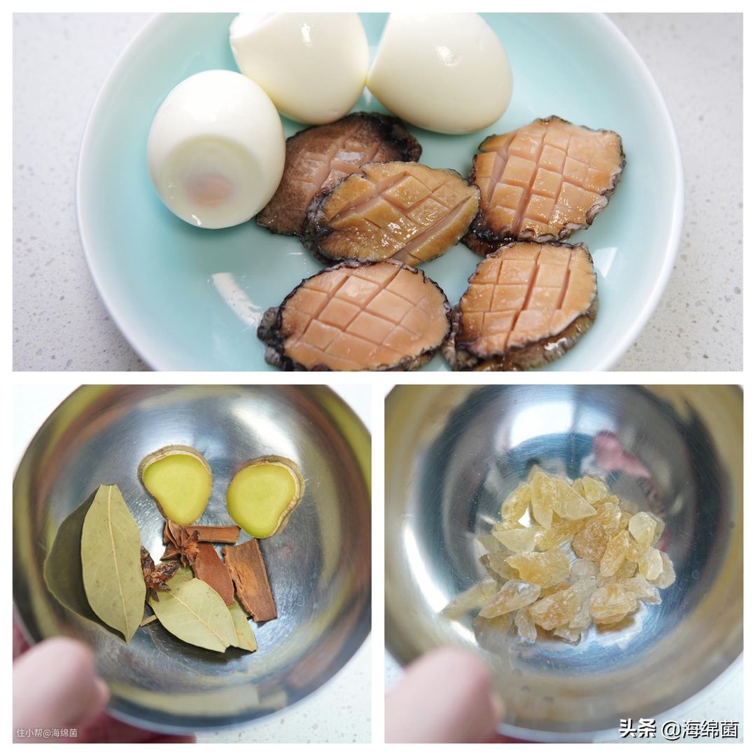 主角猪五花自然是要准备的,其他我们还需要准备八角、桂皮、香叶、姜片,适量的小颗粒冰糖,配菜的话可以用鸡蛋(鹌鹑蛋)和小鲍鱼(或者百叶结腐竹这种豆制品也可以),当然配菜不加也行,但这些配菜和红烧肉真的很搭,吃起来也有不同口感,推荐尝试下。蛋白上记得划几道帮助入味,鲍鱼也是一样。