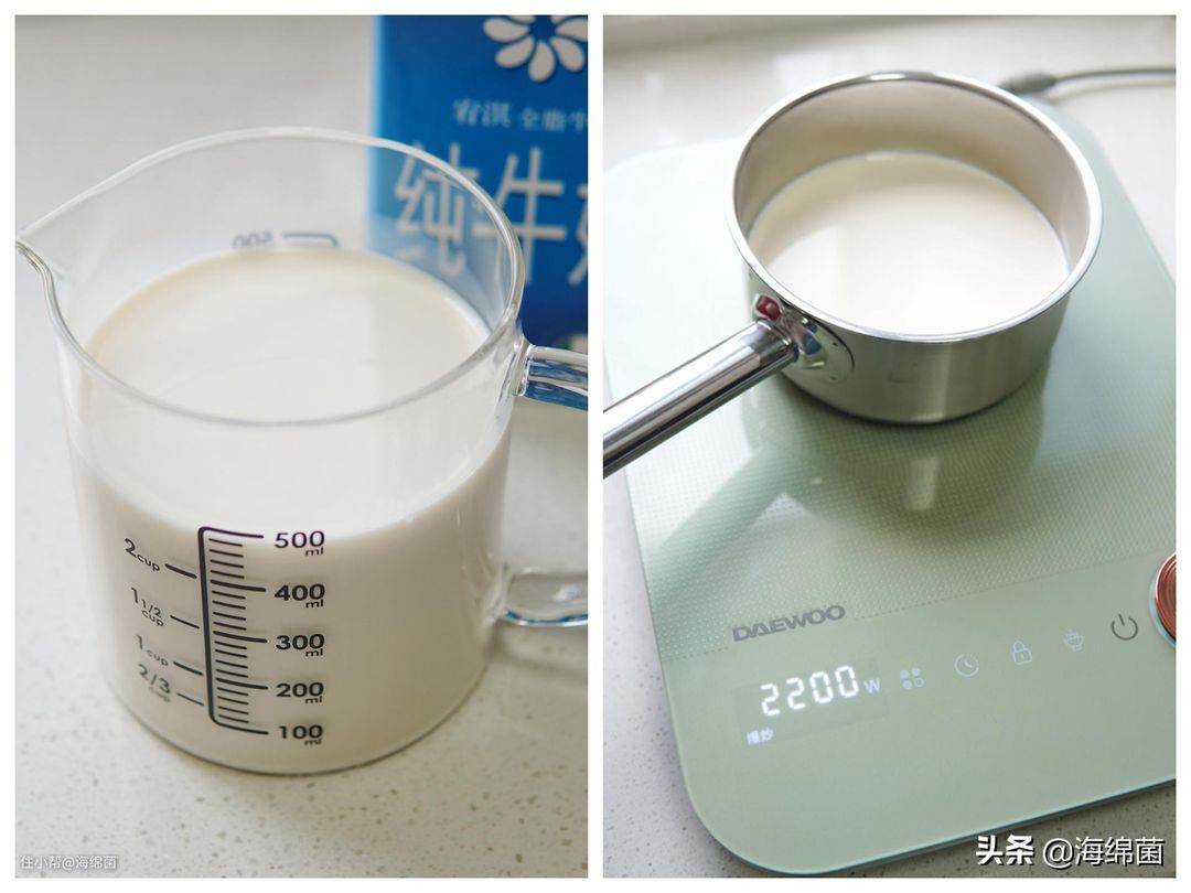 500ml牛奶加入奶锅,放到电磁炉上,500ml可以做两人份,一个人吃的话,减半即可。