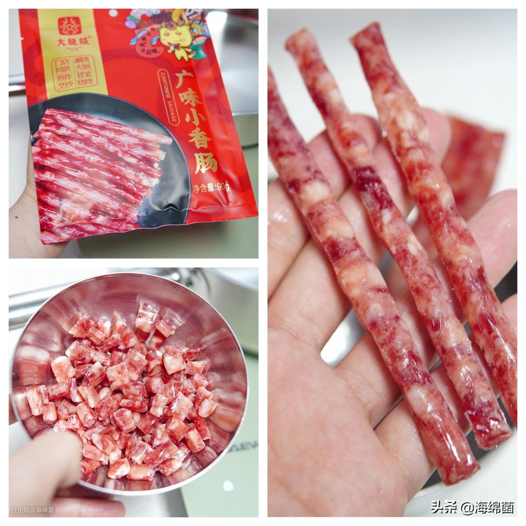 广式香肠和蛋炒饭很搭,略带酒香和甜香的广式香肠能给蛋炒饭增加很棒的口感。我尝试过很多不同的广式香肠,出品味道都挺不错的。下图这种是涮火锅用的小根香肠,不用切,直接用厨房剪刀剪成小段就行,而且小份包装一次用一包就可以,非常方便。