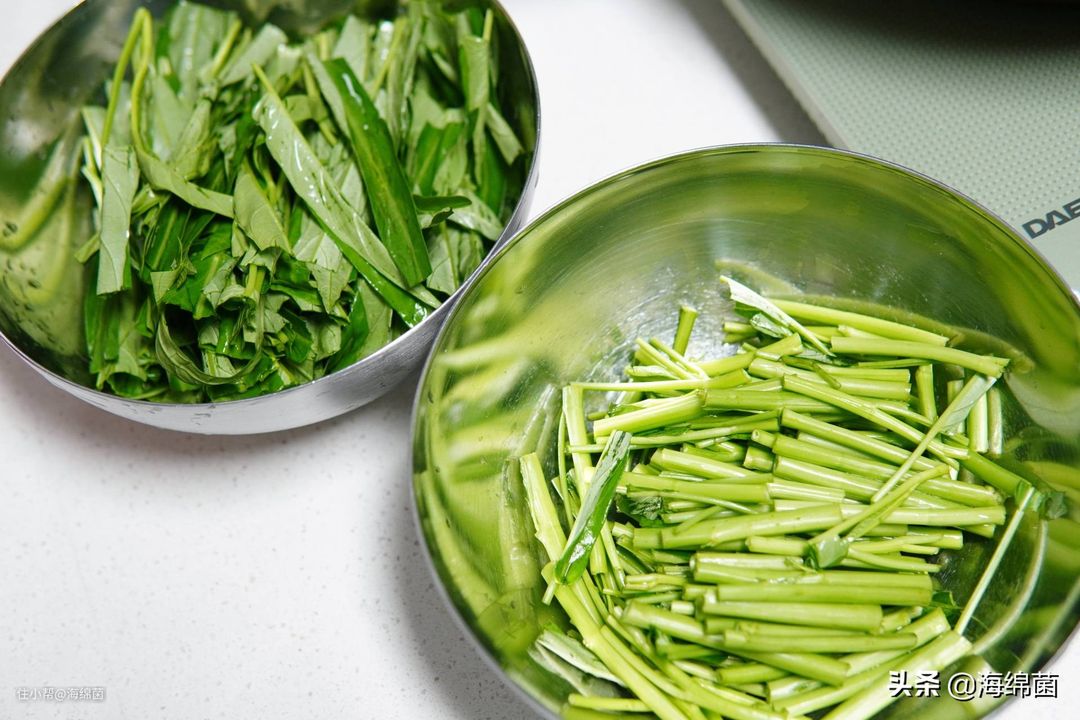 空心菜清洗处理的时候记得菜叶和菜杆要分开,之后我们会先炒菜杆再炒菜叶,这样熟度会刚刚好,出品颜色和口感都会恰当好处。