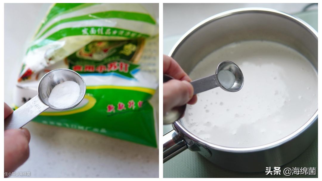 这里可能有人会有疑问,为什么要加小苏打?因为牛奶和醪糟同煮的时候会凝固反应,变成像豆腐渣一样的状态,加入小苏打就能避免这种反应。当然,如果你不喜欢添加剂,还有一种做法就是牛奶煮开后加入蛋液同煮一会,之后冲入事先放了醪糟的碗里,再搅拌均匀。因为醪糟本身就是即食的,这种做法也没什么什么问题,但口感上会略有些不同。