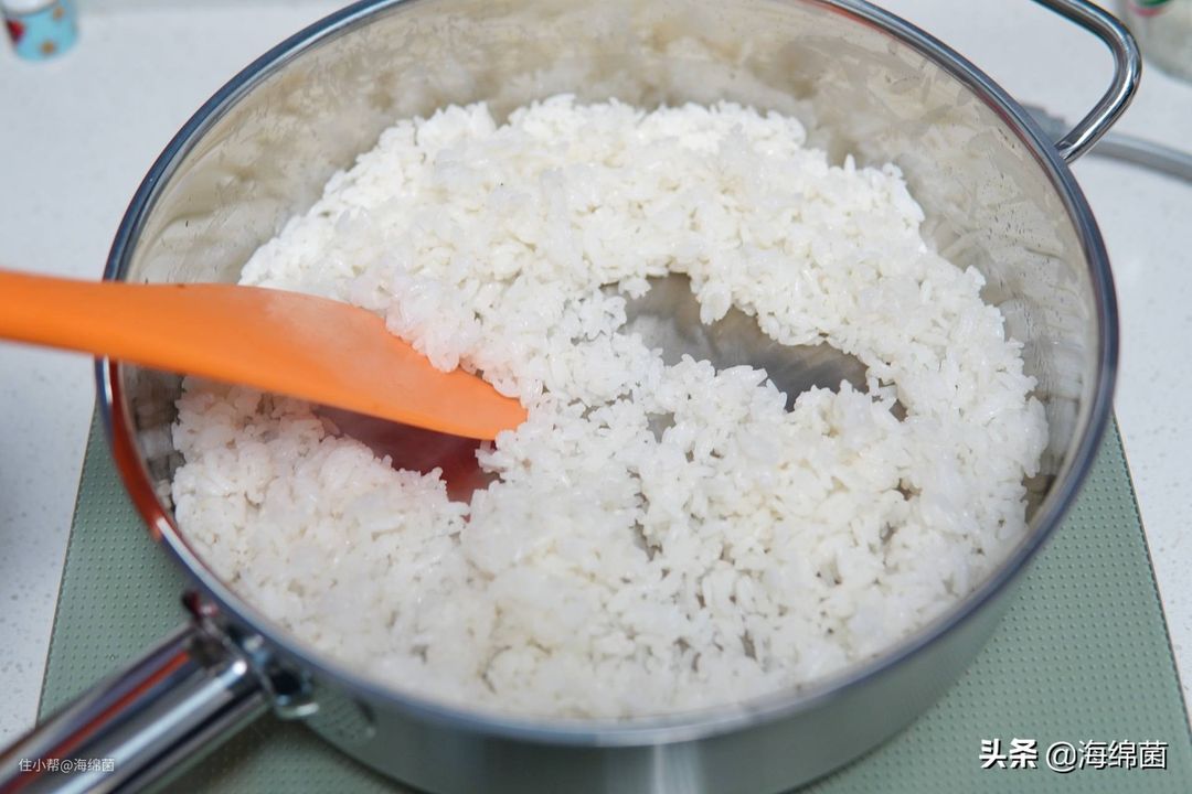 煸炒米饭的目的是为了进一步减少水汽,让米饭呈现粒粒分明的状态。