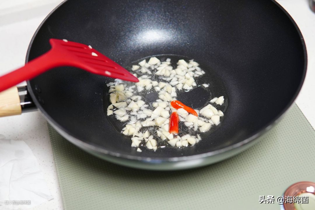 锅子里面加一点底油,直接大功率热锅,之后加入蒜末爆香,炒空心菜时蒜末不用切得过于细碎,留一点颗粒感反而吃起来更香。