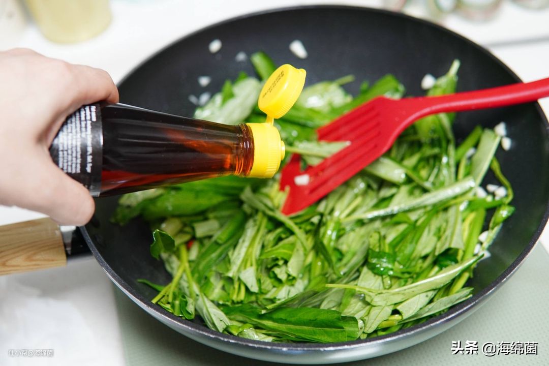 之后加入鱼露调味,因为鱼露本身就是咸鲜味的,就不用另外加盐和味精来调味了。快速翻拌之后就可以出锅了。出锅不要太慢,否则锅子的余温又会进一步加热空心菜,要是过熟出水就会影响口感了。
