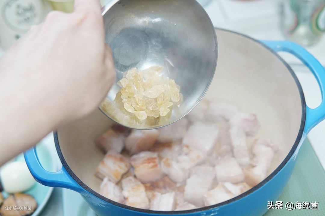 等冰糖融化,炒糖色的步骤也差不多了,加入一点点料酒,之后加入热水没过五花肉,注意这里要加入热水,需要提前准备好。