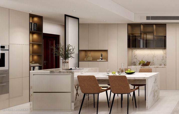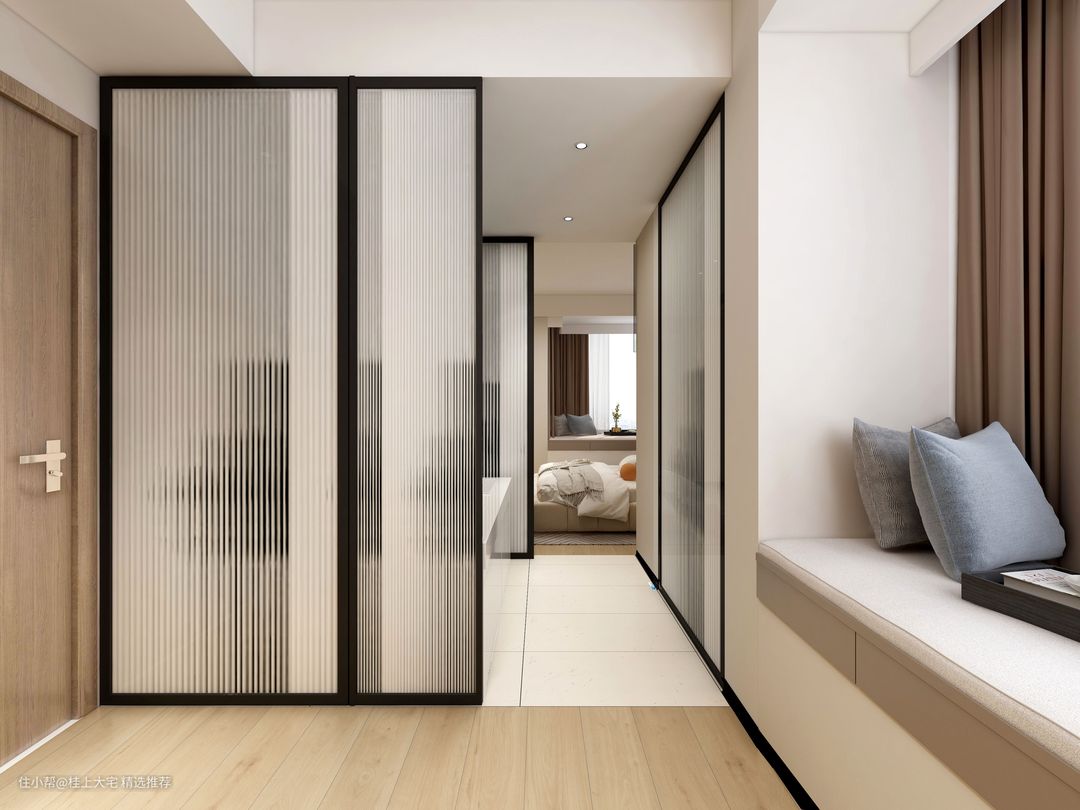 特别需要介绍的是,主卧的设计十分巧妙。设计师把私密的主卧区域打造成似酒店套房的风格,主卧门厅与洗漱区相邻,再走进去才是睡眠区域。设计手法很独特,洗漱区采用透光玻璃隔断来增加采光和互动。设计满足人基本需求功能之外,同时也打造成舒适温暖的睡眠空间,设计理念最终回归真实、简单的生活状态。