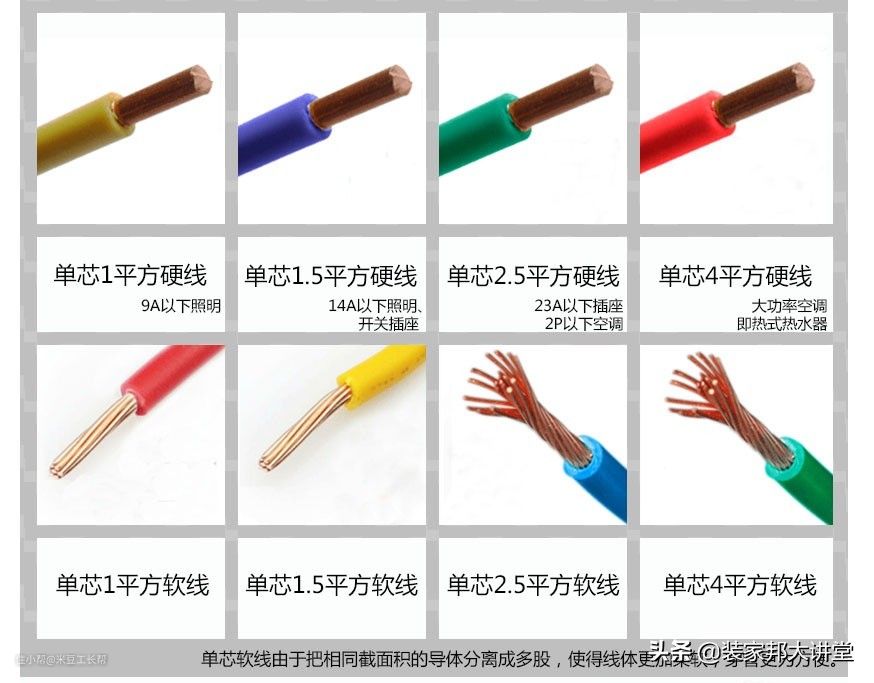 硬芯线散热要差一些,过载率不是很好,但施工中接线简单可靠;而软芯线散热很好,过载率高于单芯线,但是要求施工的电工师傅工艺技术好,通常采用锡焊技术连接软芯线。