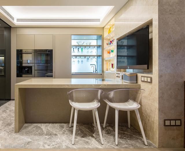 吧台的宽度也没有很明确的规定要多宽,如果你家里空间比较大,你可以把吧台做到80cm宽度,如果你家空间相对小一点,可以把吧台宽度做到60-70cm,这样也足够摆得下咖啡机、榨汁机等小家电。