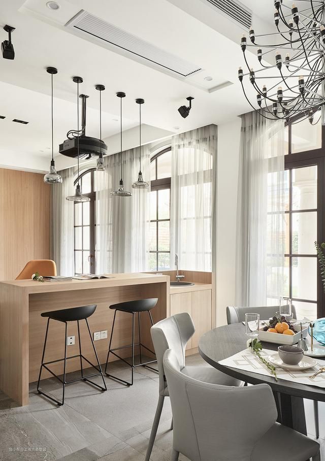 如果你家房子比较少,还可以考虑把吧台和餐桌连接起来,也可以直接把吧台当做餐桌使用,更加节省空间。
