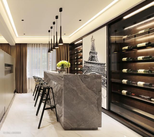 吧台可以选用天然石材,比如大理石,大理石吧台也是很常见的,看起来比较奢华大气!不过这种大理石吧台价格相对会贵一些。