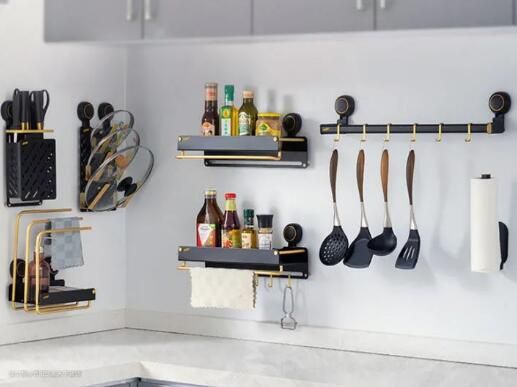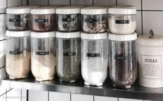 厨房面积小,台面摆放不下过多的物品,可以试着往墙上利用空间。 这种免打孔置物架直接往墙上啪叽一按就好了,不用打孔,也不用胶,完全不会损伤墙面。 放在台面上的作料也可以用瓶瓶罐罐进行分装,贴上标签,食材名称一目了然。