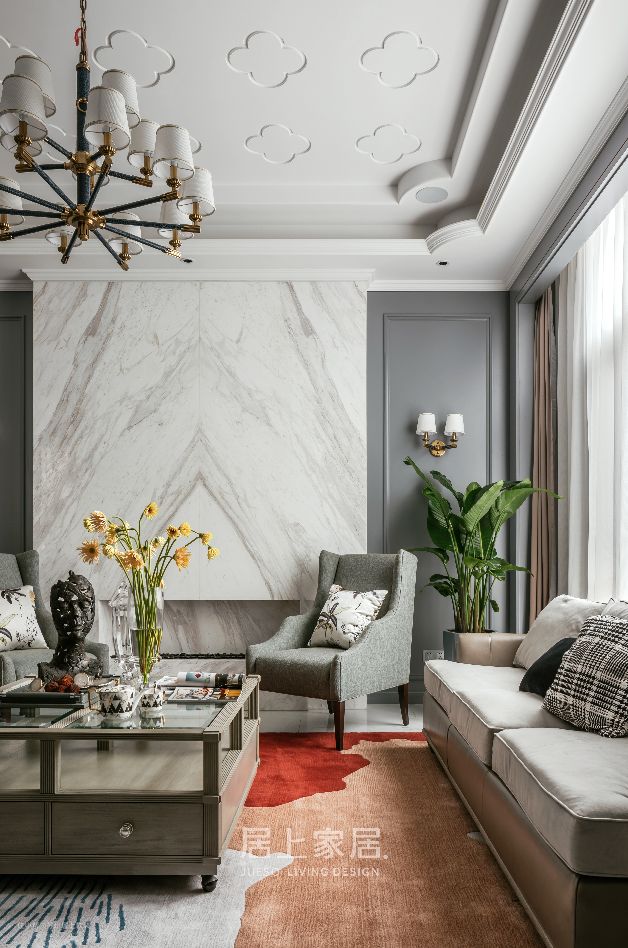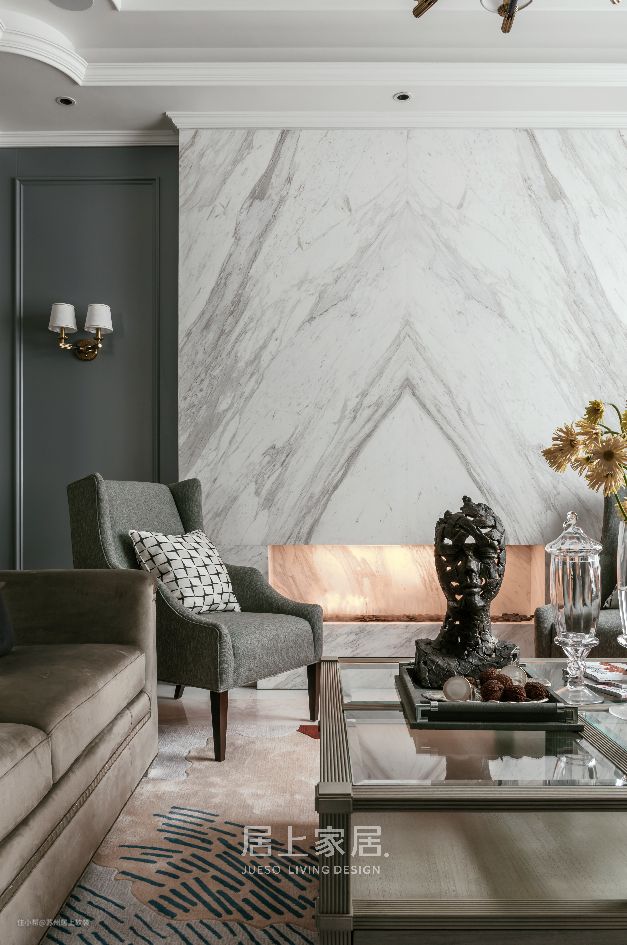 空间感知上,设计师刘云鹏更注重表现居住者的情感需求,抛弃了传统的电视功能背景,将客厅定位于家人朋友间情感交流的场所,壁炉为大理石的硬朗增添温度。