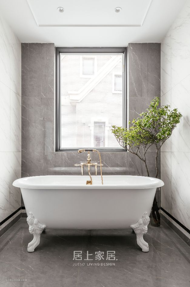 纯白复古造型的的浴缸是空间中的主角,优雅淡然,配上一株绿植,便能拥有一个极具放松的泡澡时光。暖咖色浴室柜带来一丝温柔浪漫的气息。