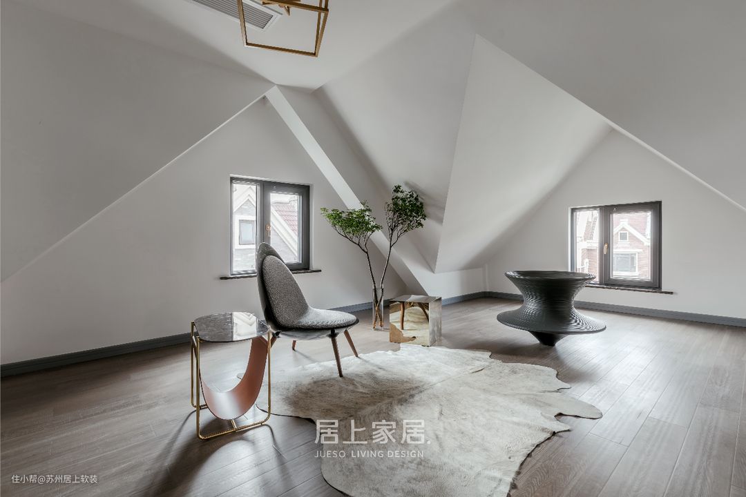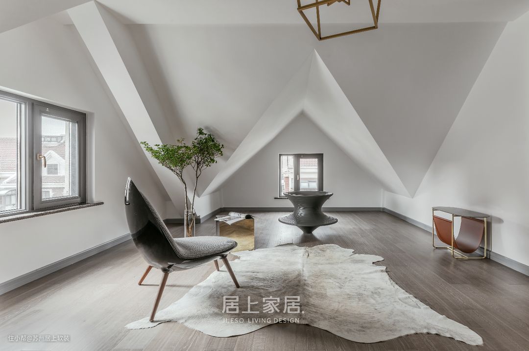 与地下室的对应的顶层阁楼,则被最大限度的剔除了功能布置。纯粹宁静的白色空间里,以屋顶的本身的立体构造,光线路径自然营造的明暗面,共塑出一个“庇护所”,置身其中不自觉会放空身心,触达内心的宁静与思索。
