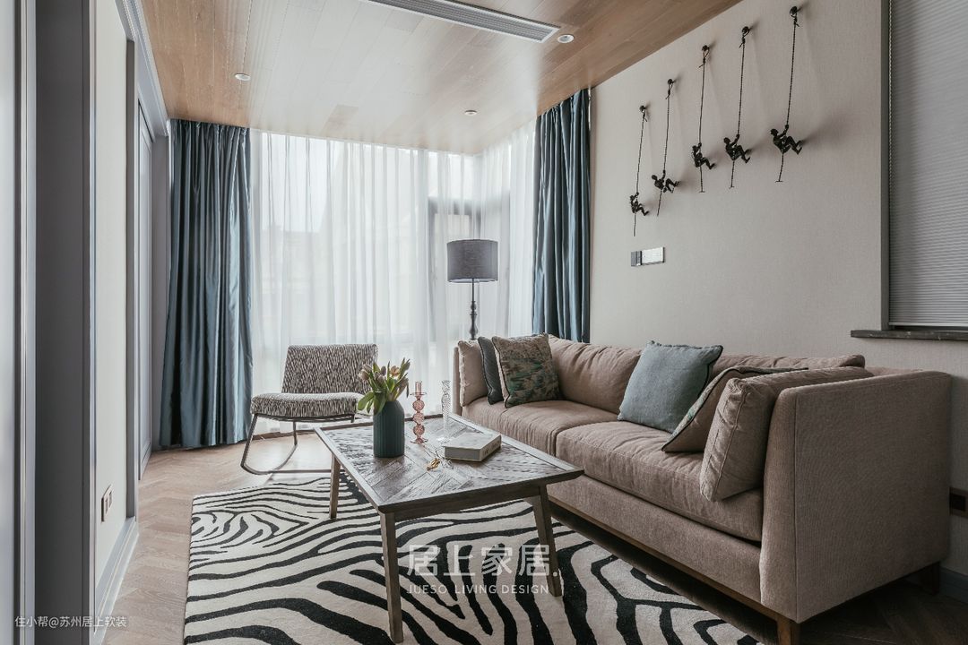 与主卧相连,设计师打造了一个起居室,这是属于主人的居心地,不需要繁复的装饰,一切舒适自然,木质顶面营造了轻松的氛围,坐感舒适的沙发足以给人带来包裹感,墙上的艺术装置趣味而有个性。