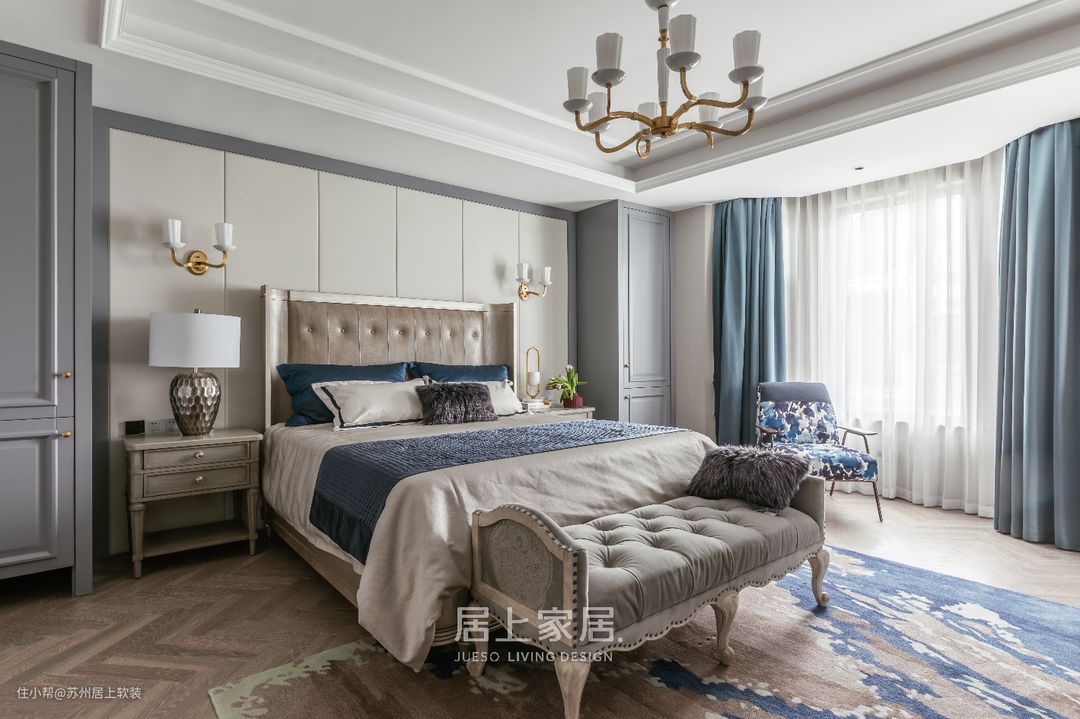 浓淡相宜的审美带来的宁静气质,依旧在主卧延续,原木人字拼的地板替换了大理石地面,温和触感更好的舒缓紧绷的神经,美式高背床融入淡淡轻奢元素,端庄高贵却不落俗套,地毯、单椅与窗帘,用互相呼应的蓝色点缀寝居空间,宁静而平和,疲惫了一天的身躯逐渐安放。