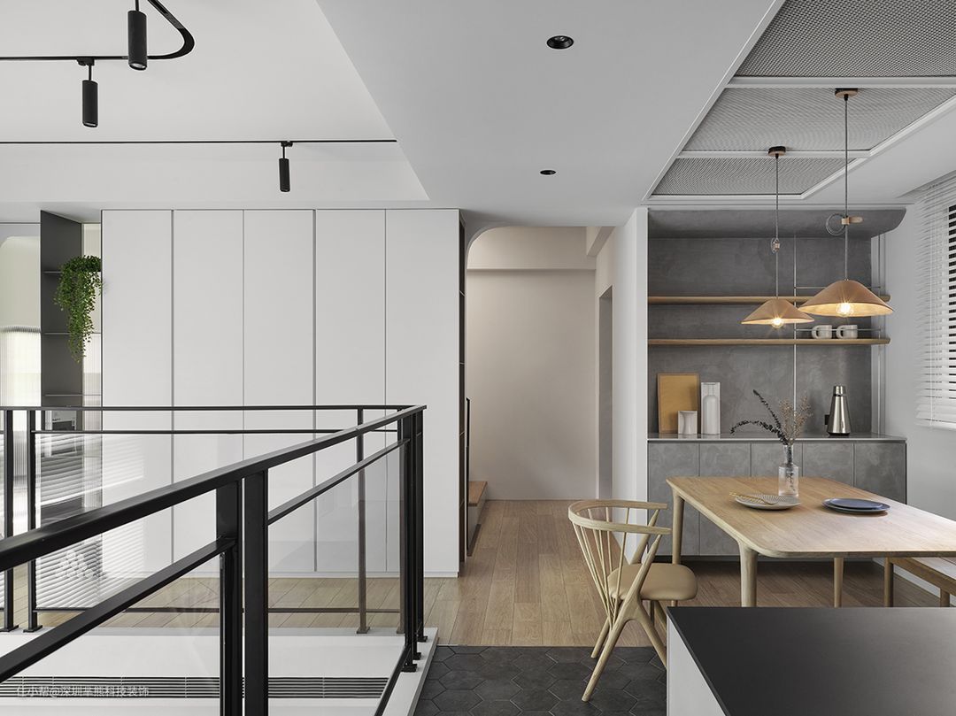 循玄关廊道入内,镜射效果引光源至左侧梯间,明亮倍增、视觉拓宽延伸。天花轴线及灰、白立面形成客厅与工作区之隐性分界。