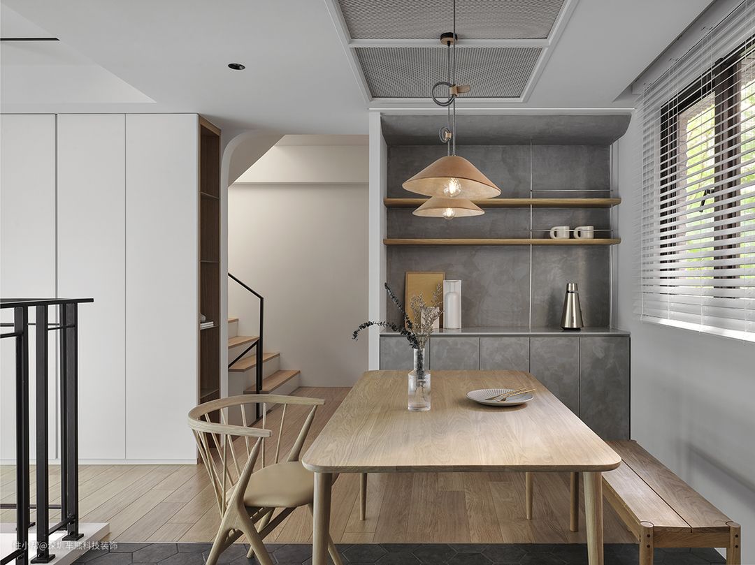 拾阶而上,木色渐增、暖度渐升!沿木地板往右依序为落地收纳柜、开放层架及储藏室,柜体变化适度消弭压迫感,储藏室半穿透长虹玻璃门片丰盈景深。餐边柜立面使用特殊涂料,结合木层板及不鏽钢圆管,巧溢天然况味。
