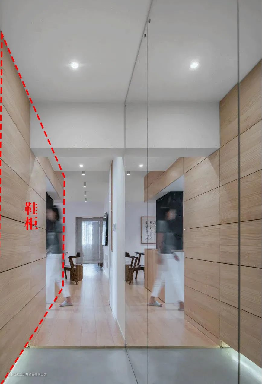 如下这个入户就是狭长走廊的户型,沿墙打造20cm深度的薄鞋柜: