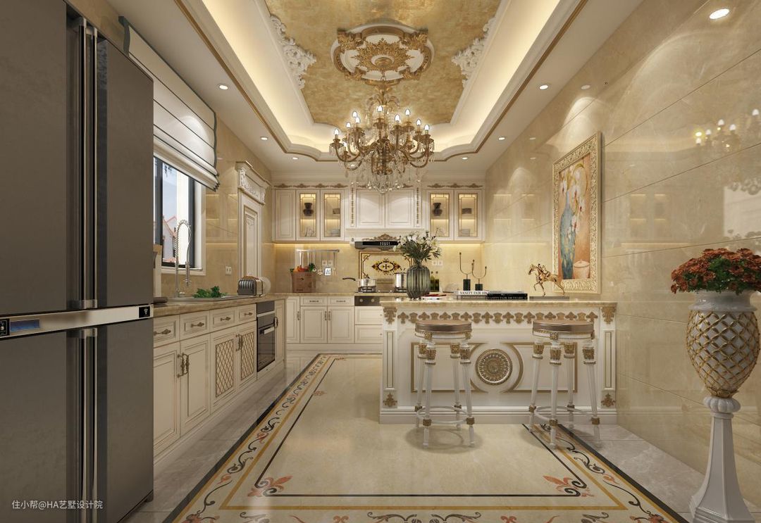 同客厅相比,厨房在气势上收敛许多。显得更温柔一些。使用了法式经典的米白色加金色的搭配,高贵典雅。吊顶和地面拼花地砖上下相对,体现了秩序和对称之美。靠墙的岛台面向外面一侧使用大量金色雕花处理,精致到不放过任何细节。