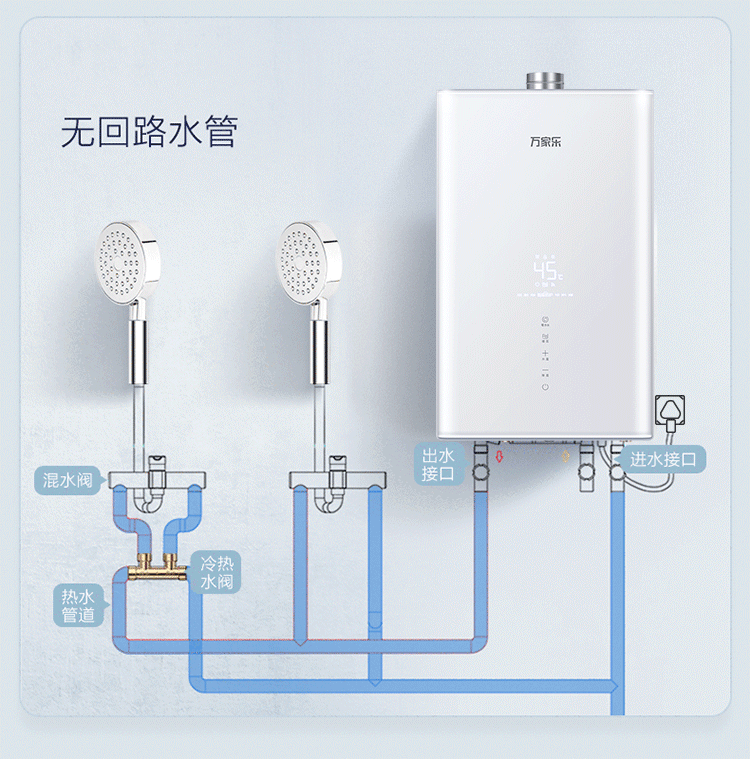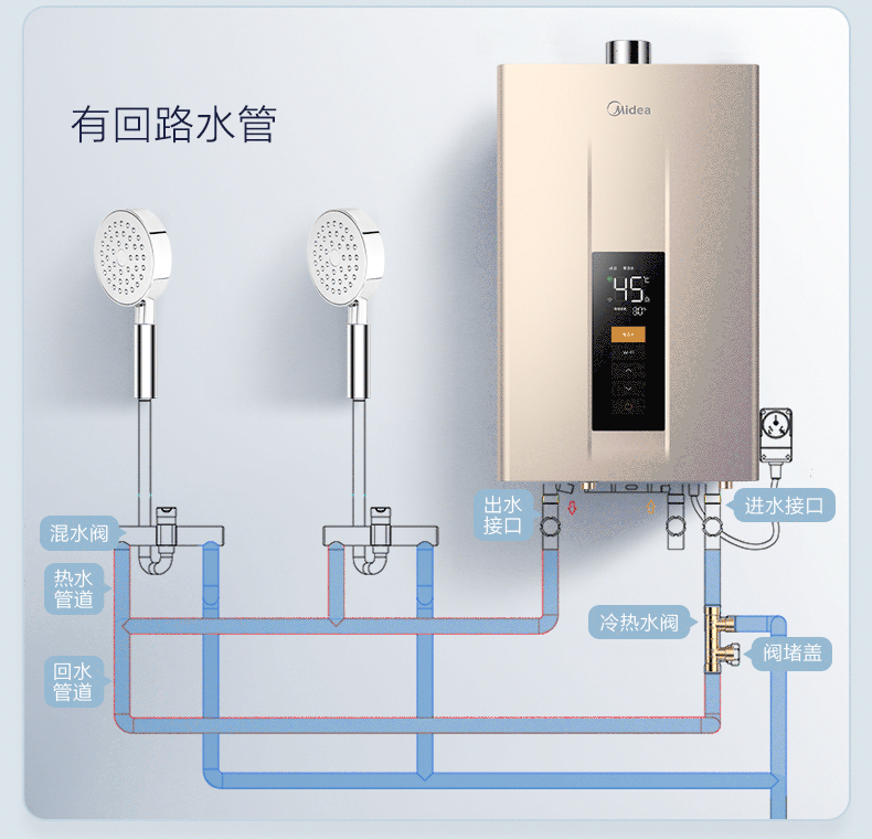 看到没有,循环泵打开后,热水管道里的水会通过回水管进入到热水器里进行加热。同时加热好的水,会填充到热水管道里。这样打开花洒后,就能直接放出热水了。