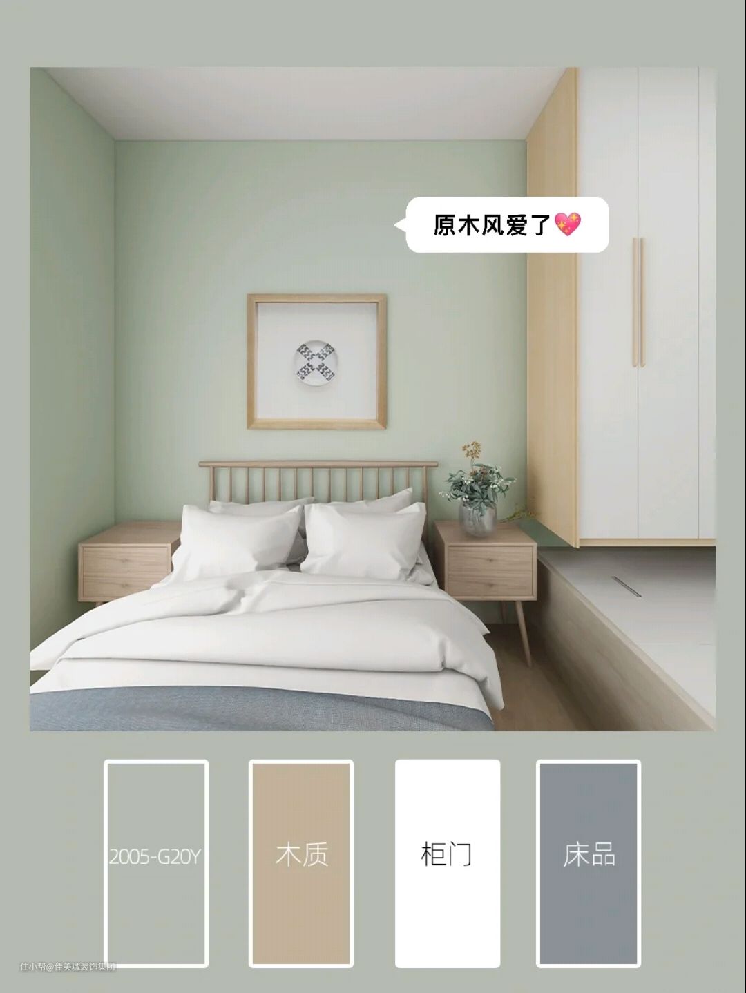 明媚又令人舒适的青玉色,大面积涂刷于卧室墙面,营造出恬适静美的画面感,衣柜搭配简约纯白,让居室保持通透感,可以适当的在装饰画或者家居用品中点缀少许亮色,来提升整个空间的色彩感。